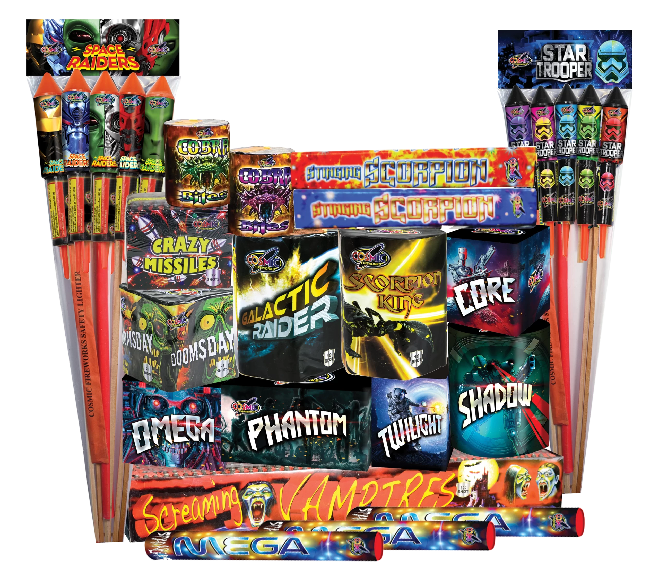 12 fireworks comprising of one of each of the following unless stated otherwise: Bonfire Heart Nukes Of Hazzard - multishot cake Enchanted Forest 2 x Sky Blitz Rockets Heatwave - multishot cake Swirl - catherine wheel Haunted House - multishot cake Twinkling Star Killer Bee Magical Stars candle Shimmering Sunrise candle