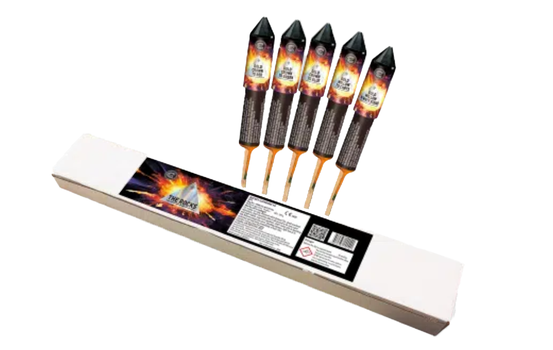 The Rocks by Celtic Fireworks. These incredible large bursting 5 rockets have the following awesome effects – brocade crown to red, brocade crown to green, brocade crown to blue, gold willow titanium chrysanthemum and gold willow with white strobe.